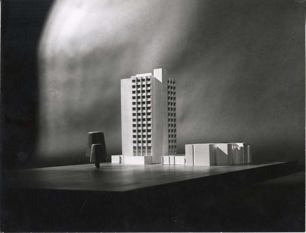 À sa manière, Vandenhove participe également au mouvement. En 1961, l’architecte est à nouveau sollicité par l’Université de Liège pour concevoir un immeuble destiné à loger les étudiants en médecine. En bordure de Meuse, le site n’est pas choisi au hasard. Alors que le projet du CHU n’en est encore qu’à ses balbutiements, le complexe de Bavière dans le quartier d’Outremeuse est encore le cœur du monde médical liégeois. Le programme confié à l’architecte est assez simple et rassemble cent chambres pour étudiants, 28 appartements pour couples mariés, un appartement pour le directeur et un autre pour le concierge. Des espaces communs (bibliothèque, restaurant, cafétéria, salles de réunion) complètent l’infrastructure. Après avoir participé à plusieurs voyages d’études – notamment à l’Université de Genève en compagnie d’André Jacqmain chargé de la construction des homes du Sart Tilman – Vandenhove présente son projet en 1963. S’inscrivant dans un dense tissu urbain, l’architecte élève une tour de quatorze étages sur un socle qui rassemble les espaces communs tandis que les logements se développent à chaque étage. Le rez-de-chaussée se développe à l’horizontale. Un volume bas de deux niveaux et à l’écart de la tour abrite le restaurant universitaire qui est relié au rez-de-chaussée de la tour par un bâtiment de liaison. Le rez-de-chaussée de la tour est occupé par le bureau du directeur, le secrétariat, une salle de réunion et la bibliothèque. Comme dans le projet Inichar, un escalier hélicoïdal conduit au premier étage qui accueille l’appartement du concierge ainsi que quelques logements destinés aux étudiantes et une salle d’étude. A chaque étage, les chambres – qui bénéficient chacune d’un balcon – s’articulent autour d’un noyau central destiné à accueillir les sanitaires. L’avant-dernier niveau est quant à lui destiné à l’appartement du directeur.