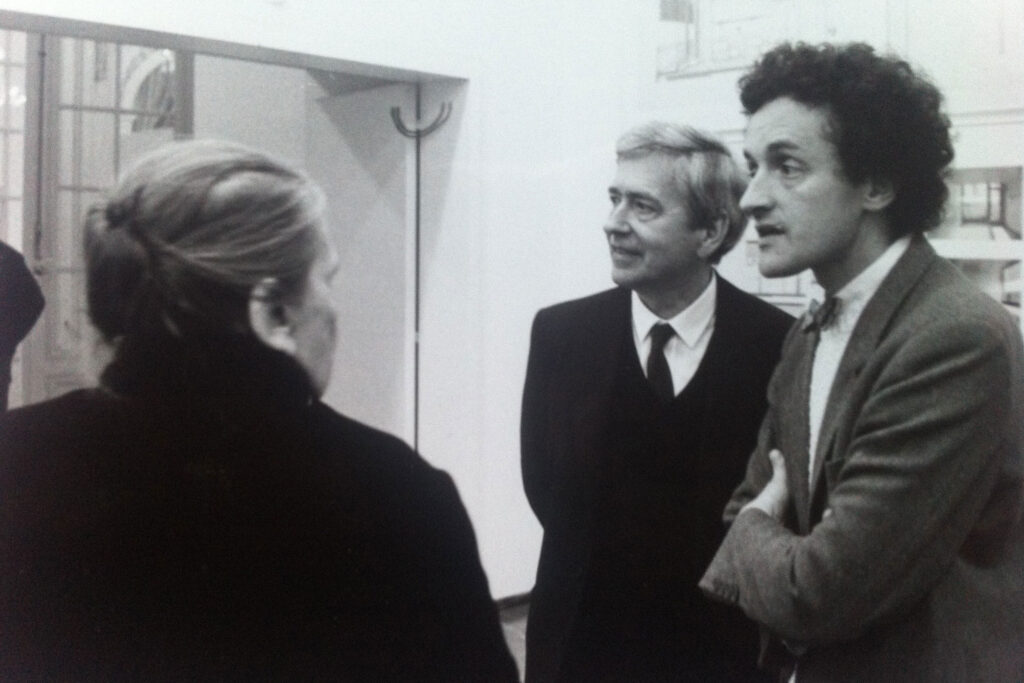 François Chaslin et le couple Vandenhove lors de l’exposition Charles Vandenhove à l’IFA, Paris, en 1985.